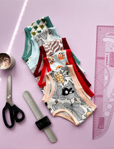 Jednoduché šití pro začátečníky ve verzi s náplety. Pro pokročilejší ve verzi s gumičkou. Kalhotky lze šít i bez zesílené vrstvy v mezinoží.