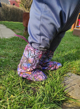 Střih na dětské capáčky do nosítka, na lezení v trávě nebo na pískoviště. Jsou dost široké, aby se dali použít i jako návlek na botičky, pokud nosíte střídavě a bojíte se, že by nožičky mohly být pak studené a dítě se nachladilo. Capáčky si ušijete zimního softshellu, podšijete slabší silnějšího fleecu nebo beránku. Použít můžete ale i jiné materiály než softshell. Například vařenou vlnou nebo jiné silnější materiály, které pomohou udržet nepropustnost.
